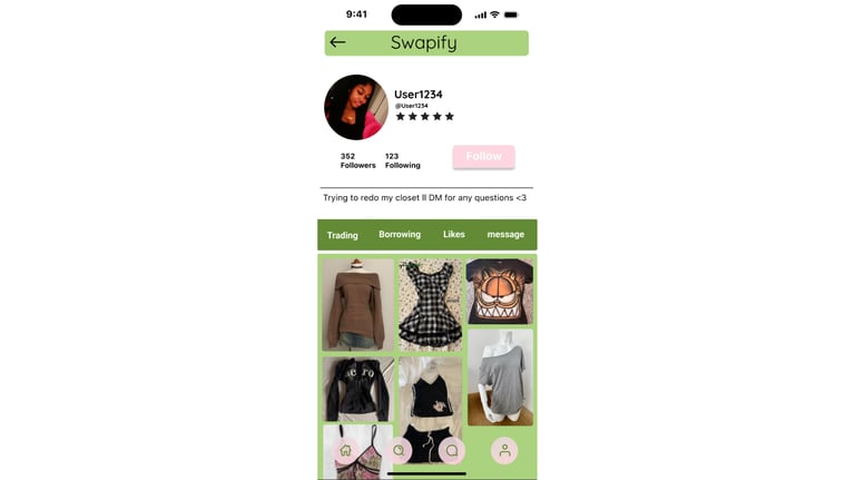 This is a design for an app called Swapify, where users can trade and borrow clothing and accessories with other users in the area. Created in Figma.